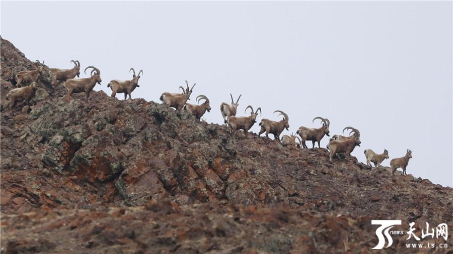 4月6日,在新疆博爾塔拉蒙古自治州境內的西天山,成群結隊的北山羊在這里聚集、覓食。進入春季后,成群的國家一級野生保護動物北山羊大量出現在博州境內的西天山,且以昔日難見的公羊群居多。每群數量多達上百只,少則也有幾十只。它們在一起覓食、嬉戲,場面十分壯觀。