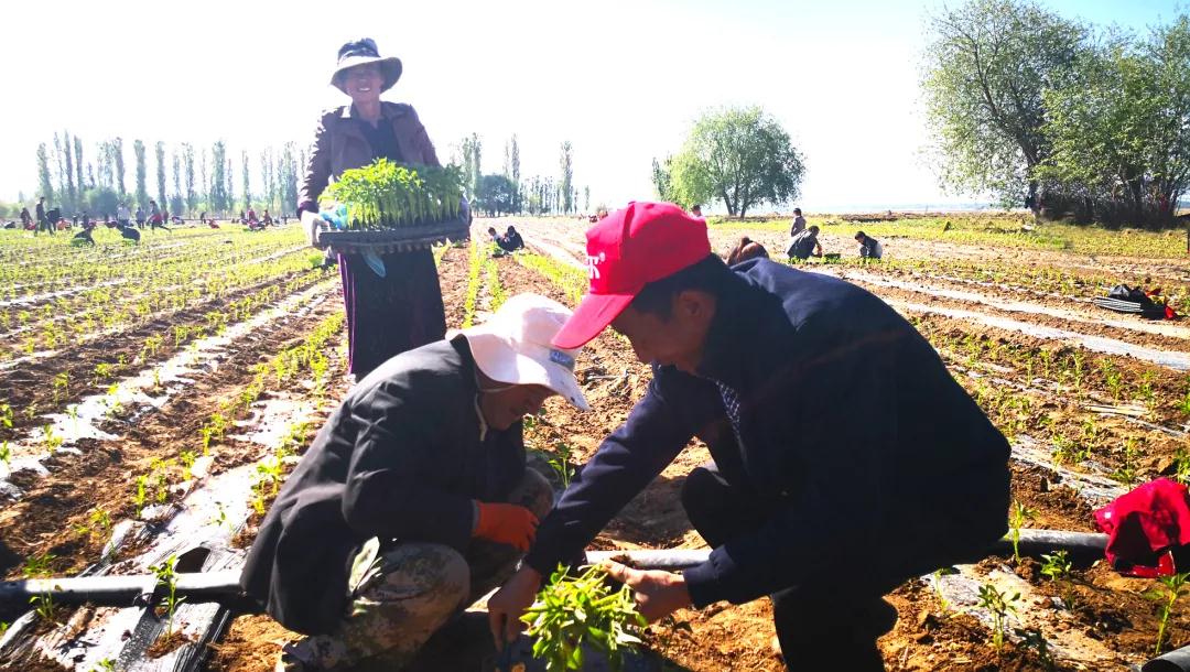 新疆平安網訊(通訊員 吳鵬)近日,在阿克蘇地區拜城縣賽里木鎮英買里村的100畝辣椒滴灌示范田內,村民塔依爾·拜爾地及近百名村民正按照科技副村長王仕兵的指導種植辣椒苗。