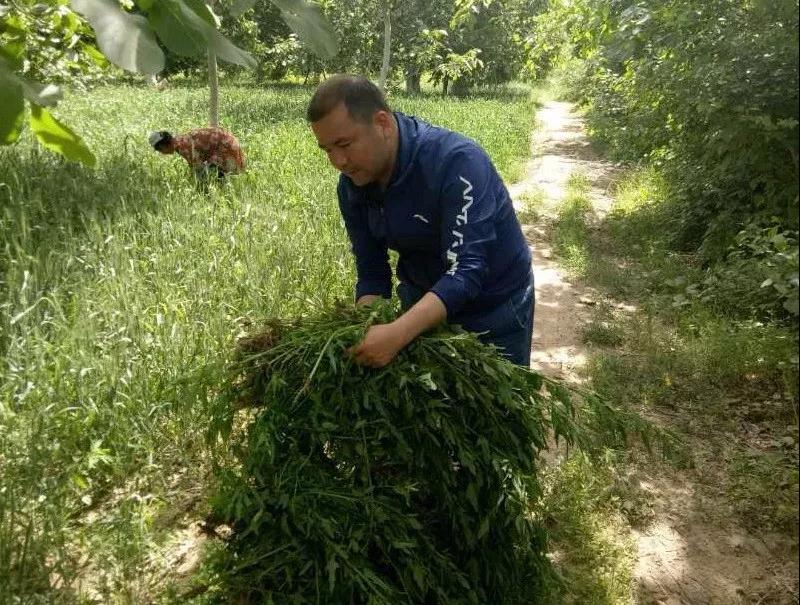 在村民喀迪爾·托合提家中的核桃地里,高院立案庭的結親干警幫助親戚拔除雜草,以實際行動扶貧助農。