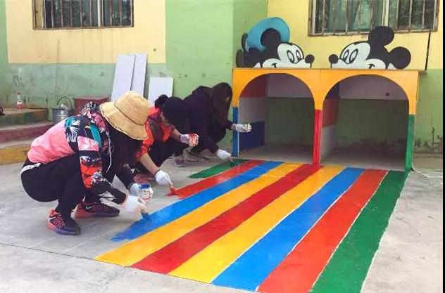 攀爬墻、梅花樁、獨木橋、盾牌、文化牌、保齡球,經過干部們一天的勞作,一批有助于孩子們鍛煉平衡、投擲、鉆爬等,集趣味性、可操作性于一體的戶外游戲設施精彩亮相。