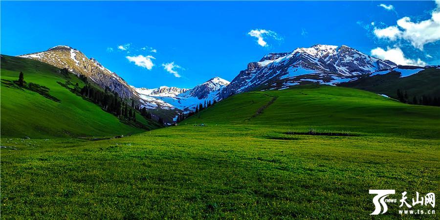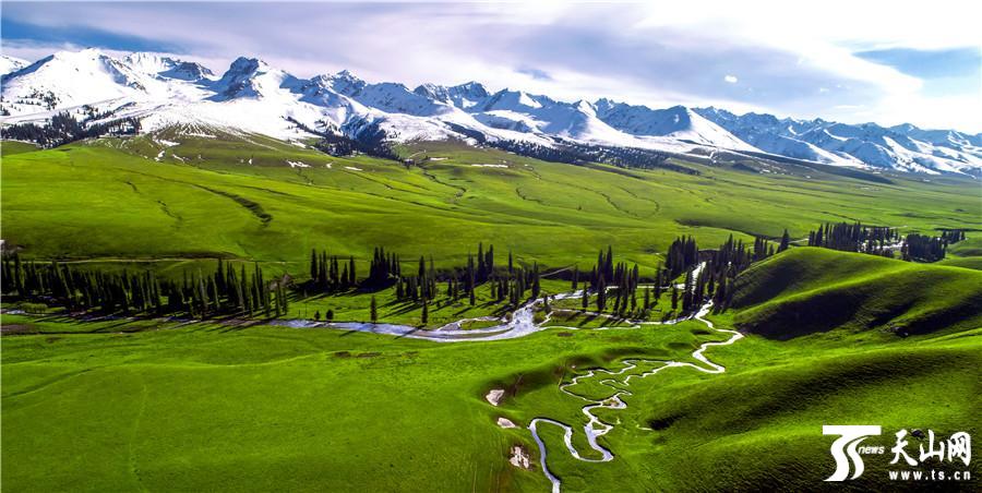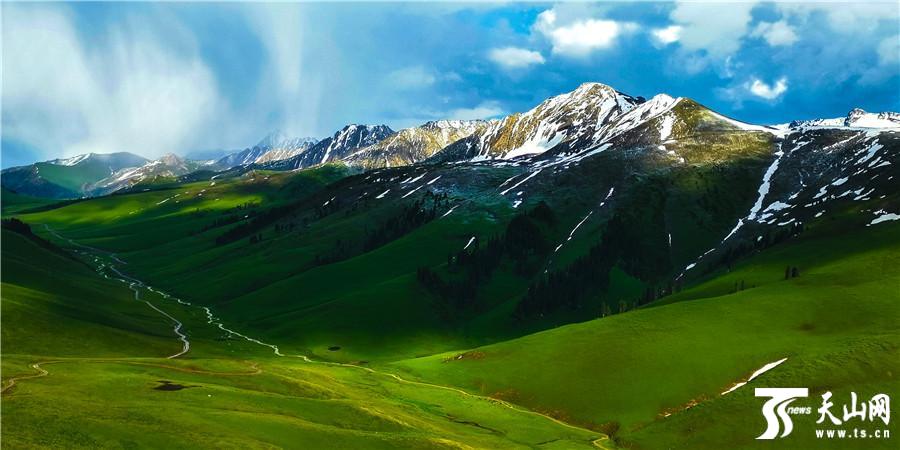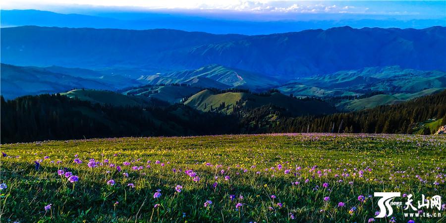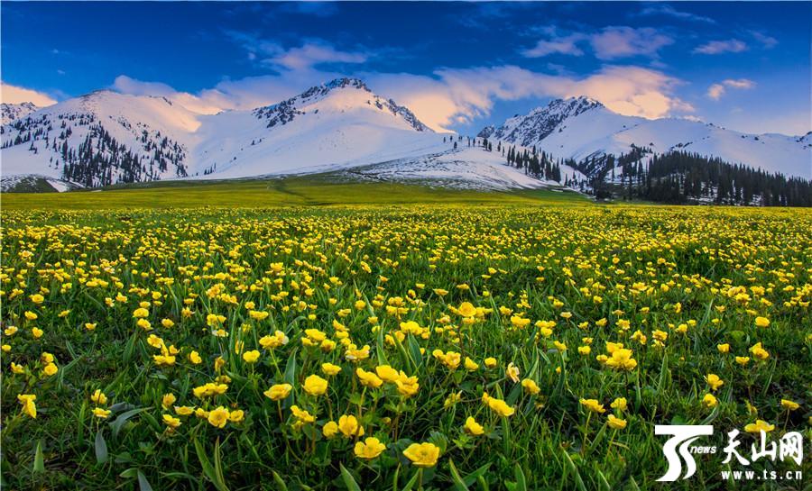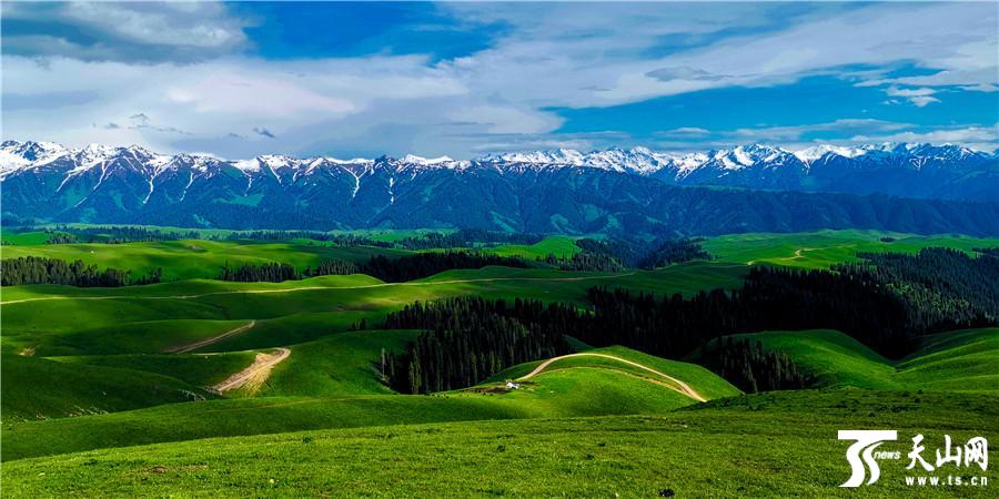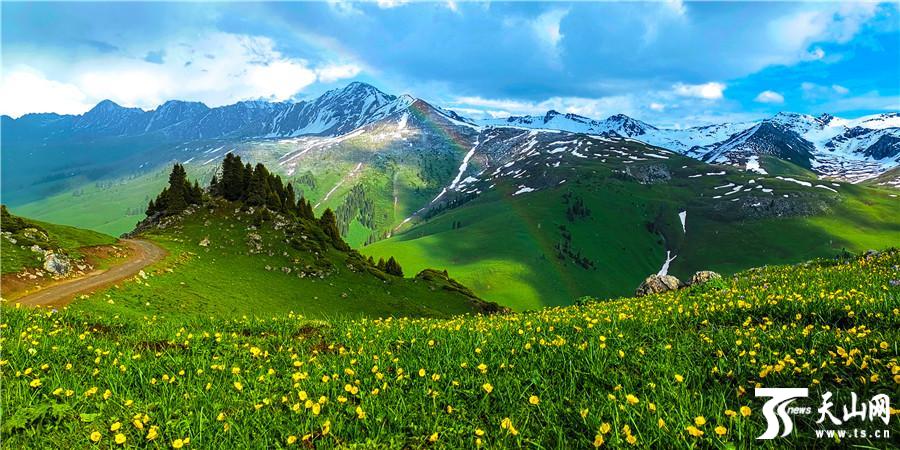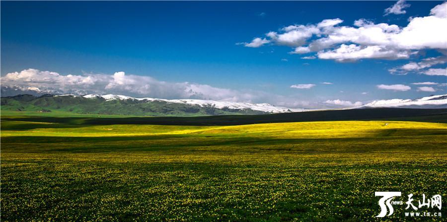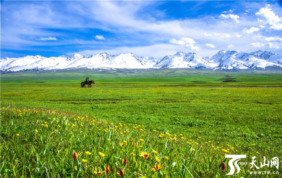 新疆平安網訊(天山網特約記者 楊曉千)進入夏季以來,新疆伊犁哈薩克自治州新源縣那拉提大草原也將一年之中最美的景色展現給世人,草原上連綿起伏一望無際的“綠地毯”一直延伸到天邊,盛開的各色野花點綴其間,成群的牛馬羊在草原上游走,遠處皚皚雪山清晰可見,頭頂朵朵白云似乎觸手可及,如詩如畫的人間仙境令無數游客為之沉醉。