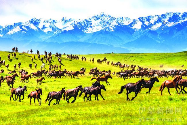盛夏時節,是一年中伊犁最美的季節。在一望無際的草原上,處處可見奇花異草爭齊斗艷、漫山遍野;藍藍的天,白白的云,綠茵茵的草地和潺潺流淌的溪水,這一切,將草原點綴的絢麗多姿,美不勝收。