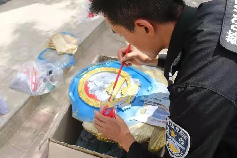 經(jīng)領導同意后,張奇榮爬上長梯。在直徑1.5米的警徽上,打磨、上色、拋光,涂涂抹抹了一下午。