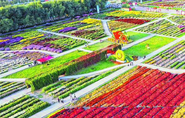 昌吉國家農業科技園區菊花展(10月6日無人機拍攝)。國慶假期,該園迎來大量游客賞花、游玩。