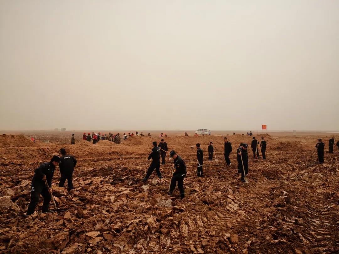 面對強勁的沙塵天氣,他們抄起鏟子,迎風(fēng)而上。漫天黃沙中,他們用雙手刻畫出一道一道筆直的田梗子,用汗水澆灌著一棵一棵嶄新的樹苗子。