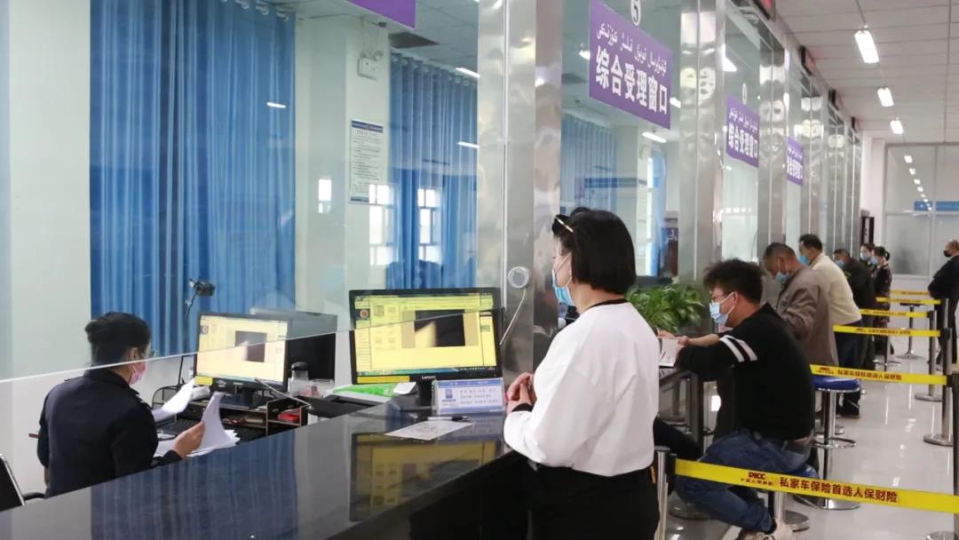在阿克蘇市公安局戶政大廳和車管所內(nèi),雖然沒有漫天飛舞的黃沙,但有著和街道上一樣的繁忙景象。