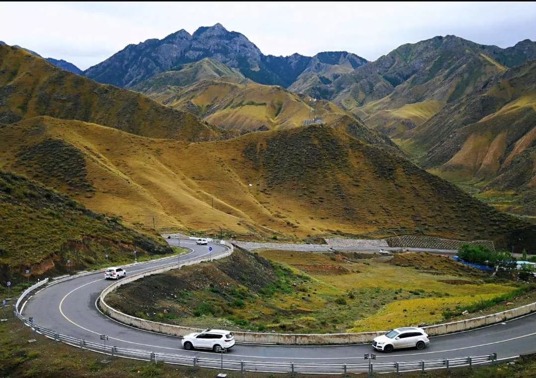 邊走邊休息,山岔路口直毛留溝服務站路邊的山坡上長滿了泛黃的高山草甸,黃綠相間的小胡楊和榆樹。在山腳的樹林邊上一排排黃顏色磚混結構的房屋齊刷刷地出現在眼前,充滿著山村的幸福氣息。