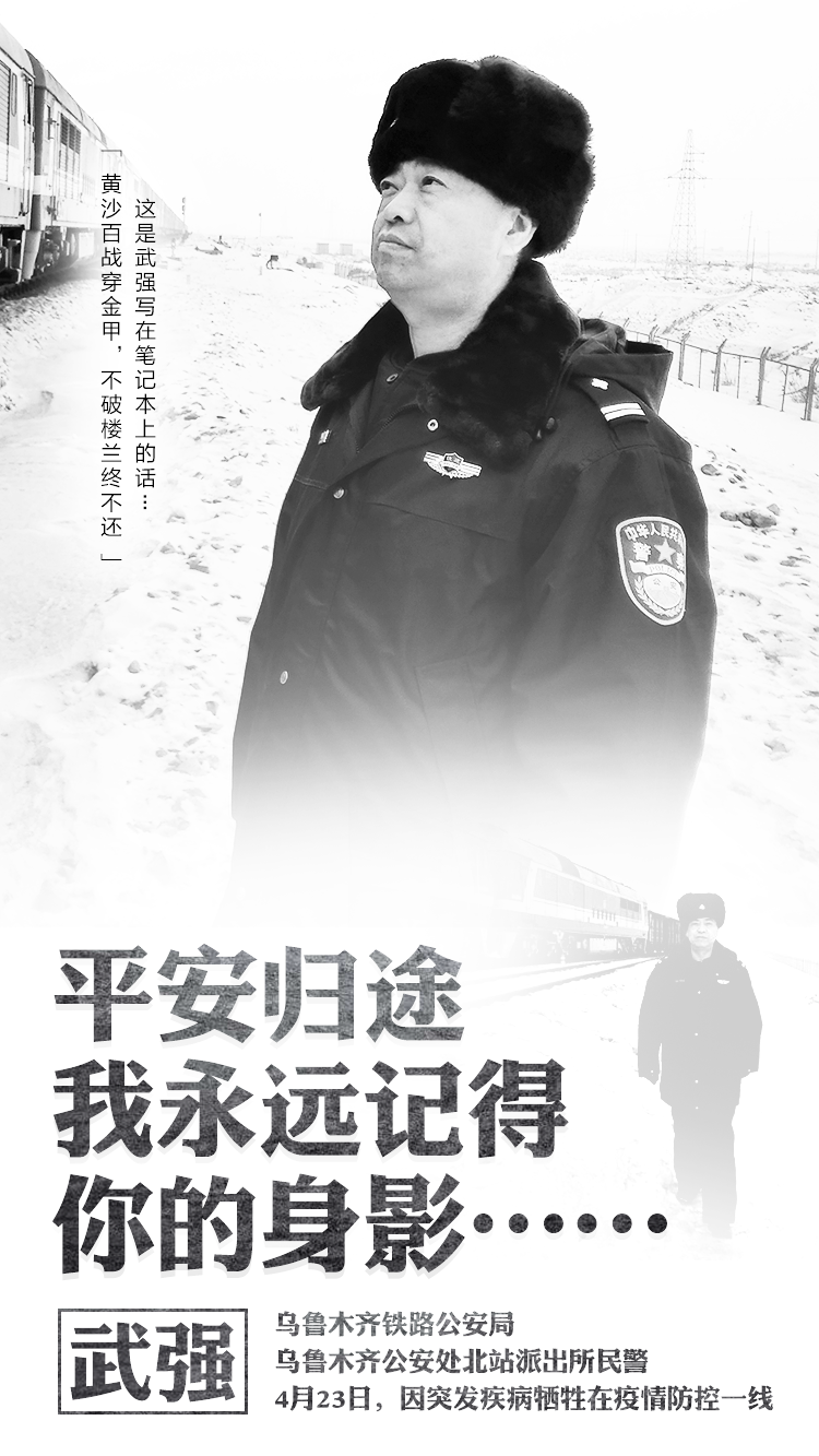 2020年4月23日,在連續(xù)奮戰(zhàn)抗擊疫情一線(xiàn)31天后,烏魯木齊鐵路公安局烏魯木齊北站派出所民警武強(qiáng),在警務(wù)區(qū)工作期間突發(fā)疾病因公犧牲,生命永遠(yuǎn)定格在了45歲,傾其所有奉獻(xiàn)在了他熱愛(ài)的烏鐵公安事業(yè)上。4月25日上午10時(shí),武強(qiáng)同志追悼會(huì)在新疆醫(yī)科大學(xué)第五附屬醫(yī)院舉行,送別戰(zhàn)友最后一程。