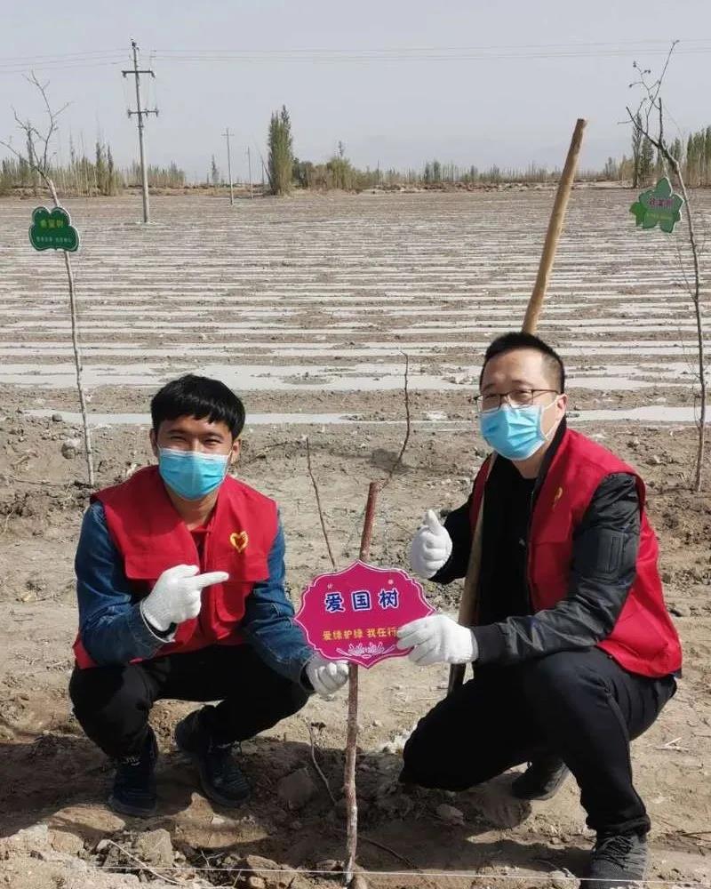 艾克熱木江和同事劉明在植樹節共同種下一顆“愛國樹”