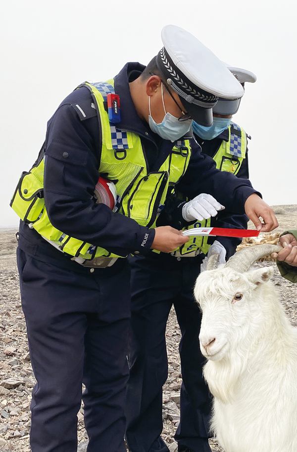 為保障道路安全,10月24日,博樂市交警大隊阿熱勒托海牧場中隊中隊長王東生和民警時寶康前往轄區,為牧民家的牛羊系反光帶,并提醒牧民禁止牛羊上路。