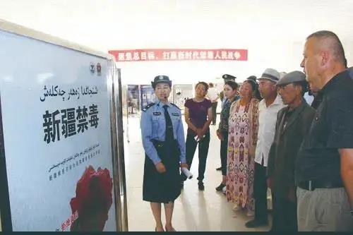 艾則孜和同事在執勤時,總會帶上有關黨的方針政策、公安戶籍業務、禁毒防毒常識、防范電信網絡詐騙等資料,給群眾普法。