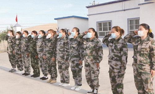 每天8時,國歌準(zhǔn)時響起,鮮艷的五星紅旗在風(fēng)中獵獵作響,阿勒泰地區(qū)吉木乃縣北沙窩女子護(hù)邊站里,護(hù)邊員們舉起右手鄭重宣誓:“邊防有我在,祖國請放心!”