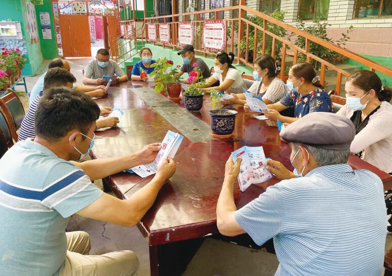 7月27日16時,伊犁哈薩克自治州昭蘇縣洪納海鎮(zhèn)克孜勒加爾村農(nóng)家法治文化大院普法活動正在進(jìn)行:一張圓桌,一壺磚茶,十來人圍坐在一起,議事、普法、拉家?!?/p>