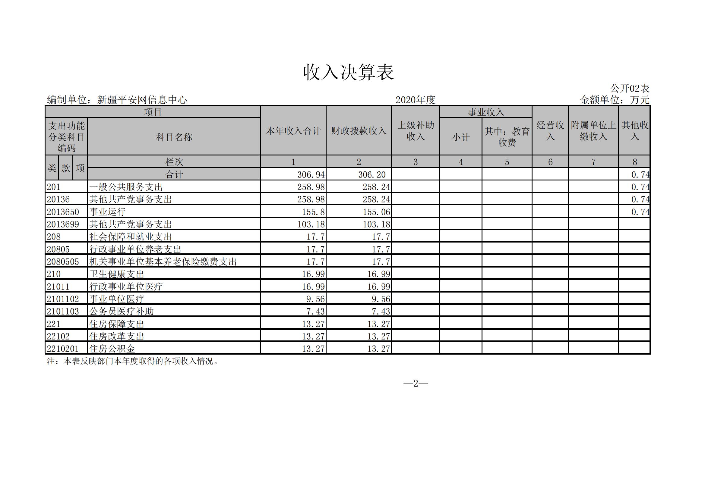 2020年度本年收入306.94萬元,其中:財政撥款收入306.2萬元,占99.76%;上級補助收入0.00萬元,占0.00%;事業收入0.00萬元,占0.00%;經營收入0.00萬元,占0.00%;附屬單位上繳收入0.00萬元,占0.00%;其他收入0.74萬元,占0.24%。