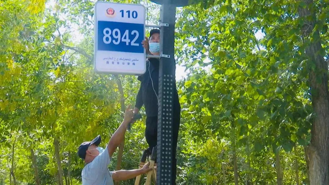8月19日,在昌吉市濱湖河中央公園內(nèi),安裝工人正按照50米左右的間隔,將一個(gè)個(gè)燈箱報(bào)警指示牌安裝在距離地面2.2米的路燈桿或電線桿上。新安裝的燈箱報(bào)警指示牌由公安藍(lán)和白色兩色組成,數(shù)字為白色,底色為公安藍(lán),上面印有“110”和4位阿拉伯?dāng)?shù)字,顯得格外醒目。
