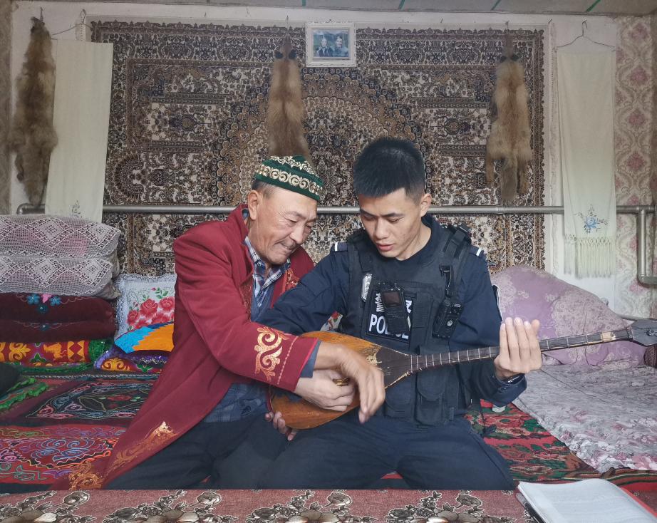 “五星紅旗迎風飄揚,勝利歌聲多么響亮……”在新疆哈巴河縣薩爾布拉克鎮巴贊·阿德力汗家中,新疆阿勒泰邊境管理支隊薩爾布拉克邊境派出所民警、輔警與老人一起唱響紅歌,向偉大的祖國告白。