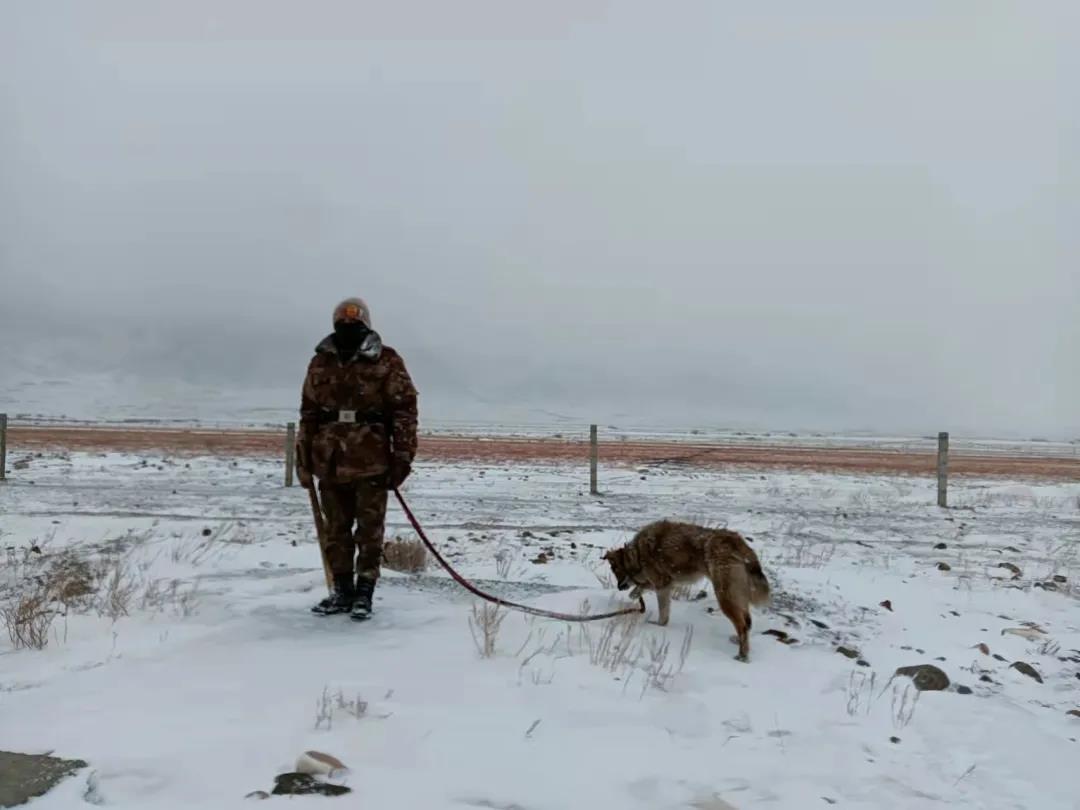 在前往16號警務站路上,記者見到了在風雪中巡邏執勤的阿依波力·麻達提汗。他左手牽著一只巡邏犬,右手持握防護器具,任憑疾風勁雪打在他的臉上、身上。阿依波力告訴記者,他今年20歲。在記者下車和他對話的短暫數十秒期間,記者舉相機的手已被凍得僵硬,而他卻笑著說:“沒事,堅持一下就可以了,我們有換班時間。”