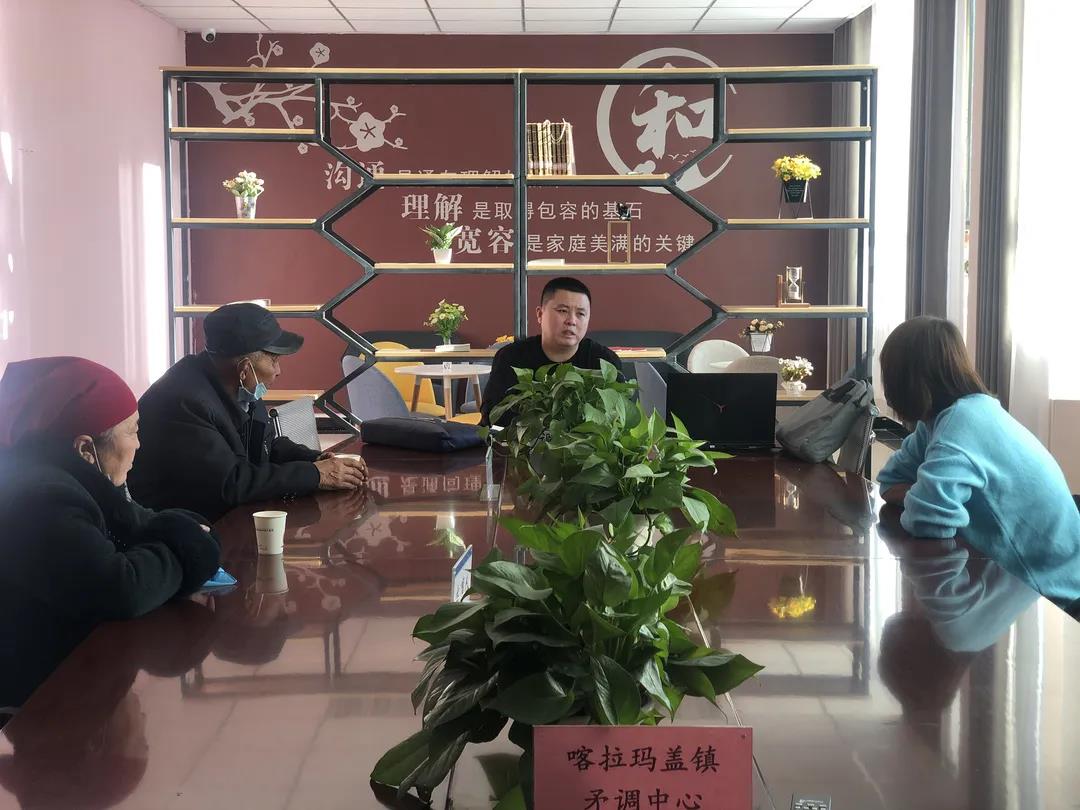 在喀拉瑪蓋鎮(zhèn)的政治、文化、經(jīng)濟(jì)中心,鎮(zhèn)政府所在地和市場經(jīng)營圈里,外面裝飾頗顯嚴(yán)肅的“喀拉瑪蓋鎮(zhèn)綜治中心”的二層樓顯得很特別,大門兩邊掛著兩幅牌匾:喀拉瑪蓋鎮(zhèn)矛盾糾紛調(diào)處化解中心和喀拉瑪蓋鎮(zhèn)司法所。