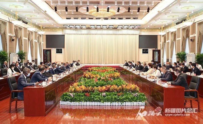 8月4日,自治區(qū)黨委書記馬興瑞、自治區(qū)主席艾爾肯·吐尼亞孜等在烏魯木齊會(huì)見來新疆參訪的伊斯蘭國(guó)家駐華使節(jié)代表團(tuán)一行。石榴云/新疆日?qǐng)?bào)記者 崔志堅(jiān)攝