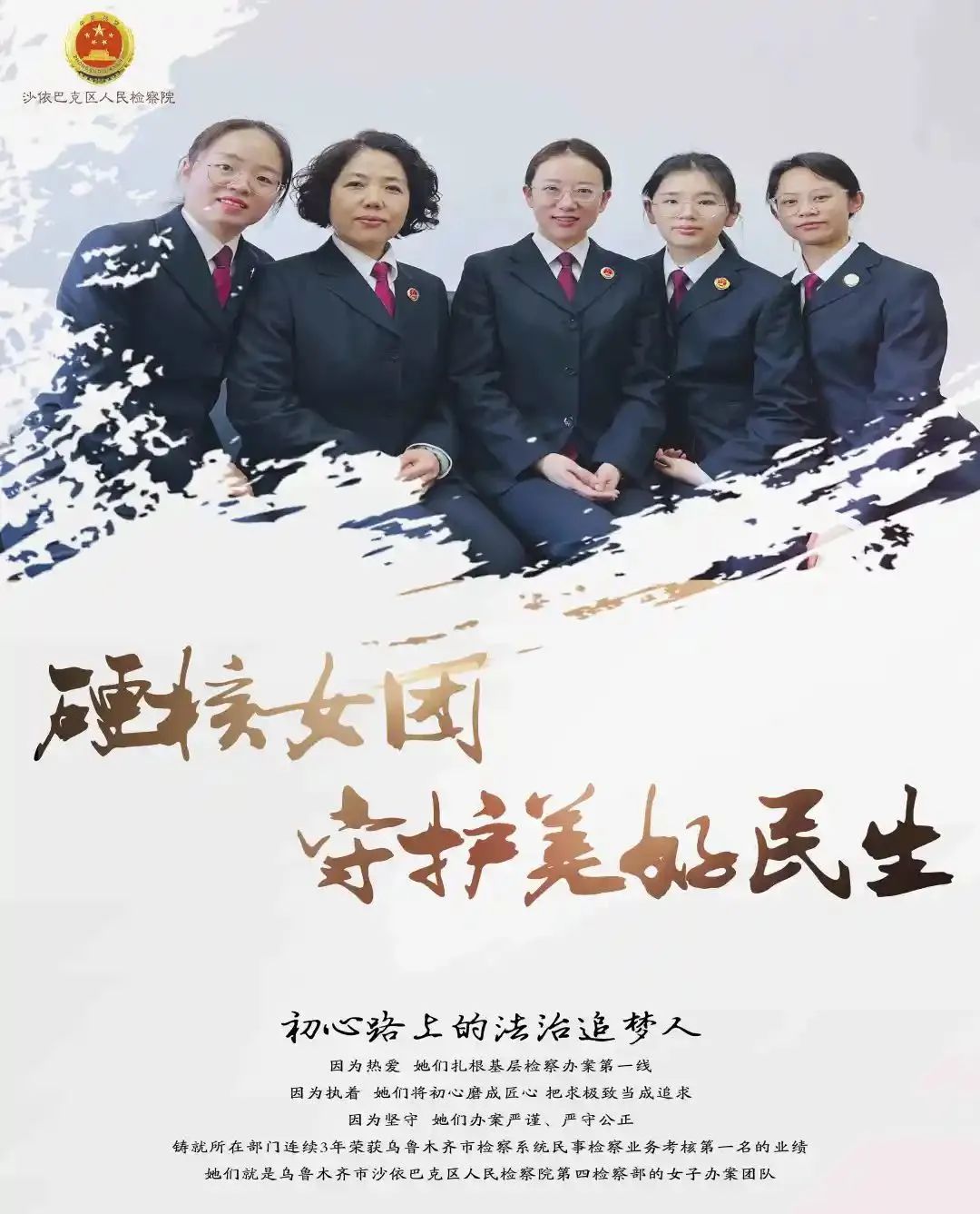 烏魯木齊市沙依巴克區人民檢察院第四檢察部是全市首個女子檢察辦案團隊,團隊成員平均年齡37.5歲。她們以女性的細膩入微融入辦案過程,將案件辦得更有質量、更富效率、更具溫度。這個團隊連續3年榮獲烏魯木齊市檢察系統民事檢察業務考核第一名。