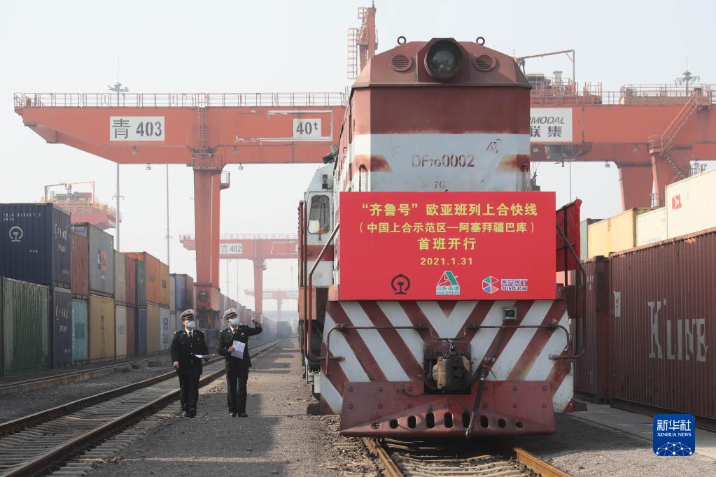 膠州海關關員對“齊魯號”歐亞班列上合快線(中國上合示范區(qū)——阿塞拜疆巴庫)線路首班列車進行檢查(2021年1月31日攝)。新華社發(fā)(解豪 攝)