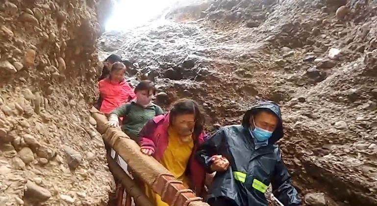 救援途中,持續的暴雨、冰雹造成山體落石,山路十分難走。在一處只能一人通過的攀登處,洪水、山頂落石不停襲來,救援人員無法前行。憑借經驗,救援人員決定原地等待洪水減弱。他們通過電話安撫被困人員情緒,要求大家原地抱團取暖,等待救援。