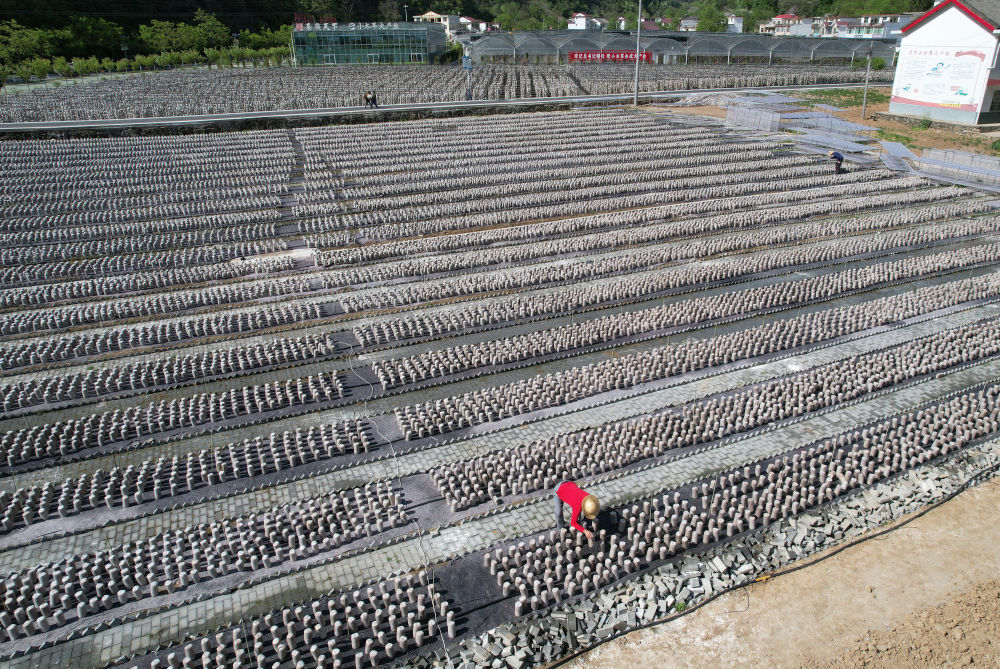 ↑農(nóng)民在陜西省商洛市柞水縣小嶺鎮(zhèn)金米村查看地栽木耳長勢(2022年4月21日攝,無人機照片)。