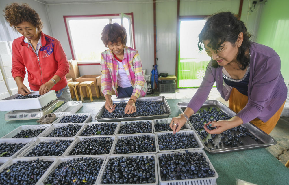 ↑黑龍江省伊春市友好區(qū)萬畝藍(lán)莓基地采摘園的工人在分揀藍(lán)莓(2019年8月8日攝)。