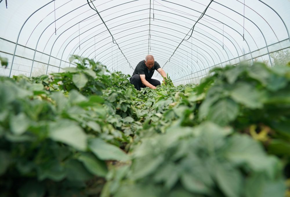 ↑河北省張北縣德勝村村民在馬鈴薯大棚內(nèi)勞作(2020年8月12日攝)。