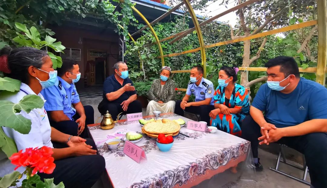 新疆維吾爾自治區喀什市公安局乃則爾巴格派出所位于城鄉接合部,該所發揮轄區基層人民調解員積極作用,創新調解工作方式方法,在轄區優秀人民調解員家中設立“庭院調解點”,警民合力就近方便快捷化解百姓“疙瘩事兒”,解開群眾“煩心事兒”,捋順居民心氣兒,促進轄區社會和諧穩定。圖為7月26日,在乃則爾巴格鎮尤喀克喀孜熱克村村民阿布都克力木、阿布都熱依木家的“庭院調解點”里,派出所民警和人民調解員阿布都克力木、阿布都熱依木,共同調解成功一起鄰里之間的矛盾糾紛。