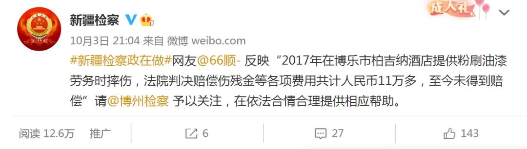 10月3日 16時48,網友“@66順- ”通過微博反映,母親2017年在博爾塔拉蒙古自治州博樂市一家酒店提供粉刷油漆勞務時摔傷,法院判決賠償傷殘金等各項費用共計人民幣11萬多,至今未得到賠償,并艾特“@新疆檢察”尋求幫助。