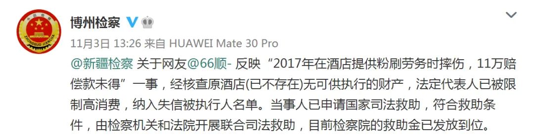 11月3日13時26分,“@博州檢察”再次發微博稱,涉事酒店無可執行財產,法人已被限高消費、納入失信被執行人名單。當事人符合司法救助條件,提出申請后,檢察院和法院已聯合開展司法救助,目前,檢察院的救助金已發到位。