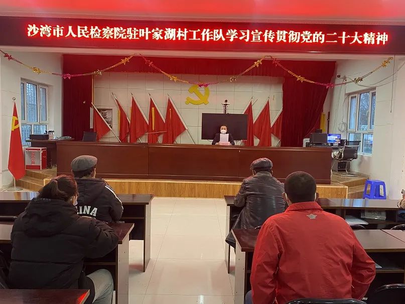沙灣市人民檢察院駐大泉鄉葉家湖村“訪惠聚”工作隊隊長、第一書記佳妮古麗?哈布拉合買提帶頭學、領頭講,用通俗易懂的話將身邊的發展變化與黨的二十大精神結合起來,引起了村民和黨員群眾的共鳴。