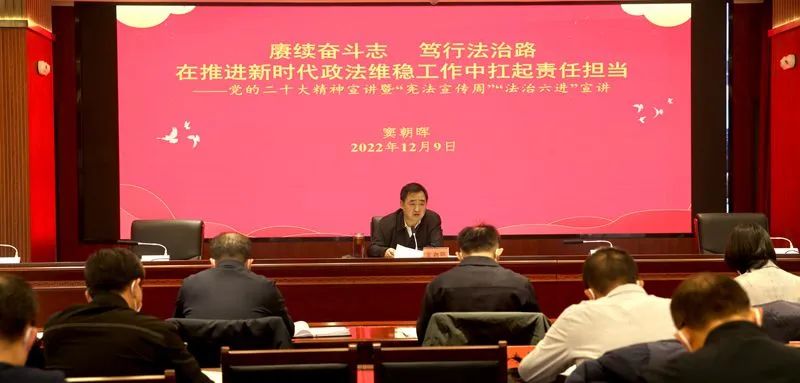 新疆平安網訊 12月9日,自治區黨委政法委舉行黨的二十大精神暨“憲法宣傳周”“法治六進”宣講活動。自治區黨委政法委常務副書記、新疆法學會黨組書記竇朝暉以《賡續奮斗志 篤行法治路 在推進新時代政法維穩工作中扛起責任擔當》為題,為機關全體黨員干部宣講,強調要立足新疆政法維穩工作實際,深入學習貫徹黨的二十大精神,以習近平法治思想為指引,全面貫徹實施憲法,助力建設更高水平的平安新疆法治新疆。