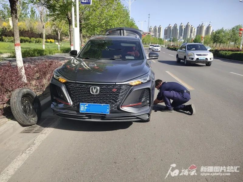 4月29日16時許,伊寧縣居民陳先生正愜意地駕車游覽伊寧市的伊犁河旅游風景區,沒想到途中車輛突然爆胎,作為新手司機,他拿出備胎后一籌莫展。此時,伊寧市公安局伊犁河路派出所執勤民警巡邏至此,趕緊上前幫助。
