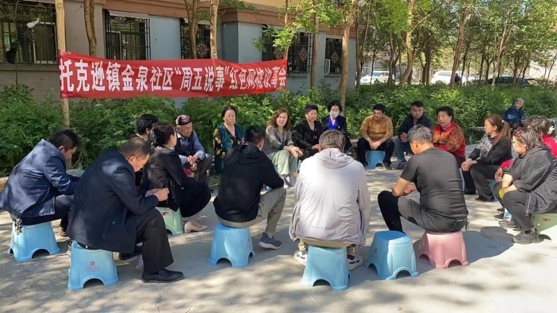 5月26日11時,吐魯番市托克遜縣托克遜鎮金泉社區黨總支書記周亞琴和社區副書記托合提·巴哈依等5名社區干部端著小板凳,來到美匯小區的樹蔭下組織居民說事,對不久前收集到的群眾訴求解決情況向群眾反饋。