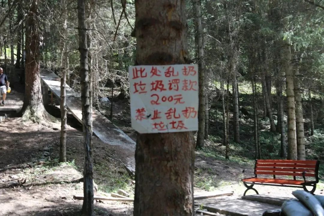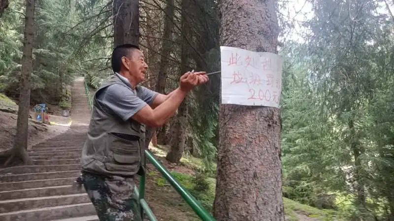 在景區內,檢察官發現山腳下和登山扶梯旁有很多樹木被裹上鐵皮,鐵皮上用紅色油漆歪歪扭扭寫著“此處亂扔垃圾罰款200元”“河內禁止亂扔木頭、石子,違者罰款200元”等字樣,每塊鐵皮都用6-9枚鐵釘固定在樹干上。