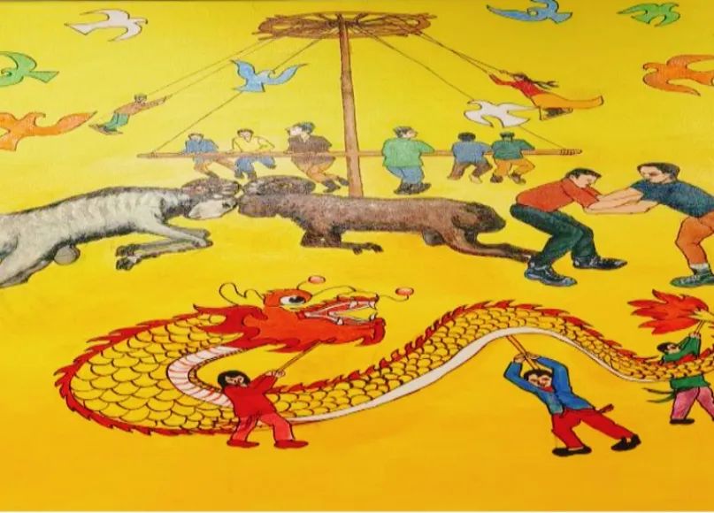此畫展現麥蓋提縣維吾爾刀郎麥西熱甫活動場景,百姓以開展摔跤、斗羊、舞龍以及薩哈爾迪挑戰賽等活動形式,表達對美好生活的祝福,對偉大祖國繁榮昌盛的祝愿。