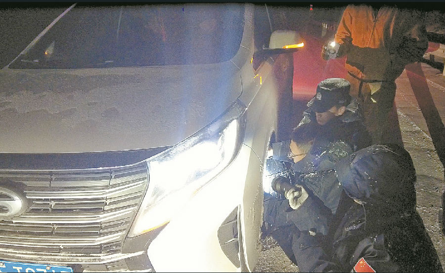奇臺達坂距離大紅柳灘警務站60公里,站長李雪松與同事趕到事發地后勘查發現,車輛受困的主要原因是事發路段路面結冰,加之駕駛人沒有為車輛更換雪地胎,導致車輪打滑無法行駛。李雪松和同事將事先準備好的防滑鏈安裝到被困車上,車輛得以重新上路。