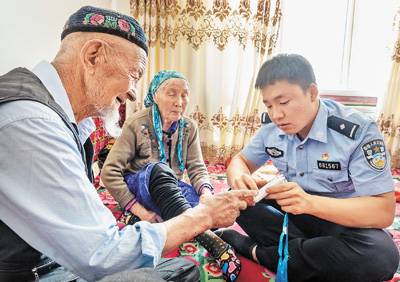 一揮手,警車停在了身邊。阿卜杜瓦依提·爾格乃老人和民警們打起招呼,“捎一段,到衛生院停。”