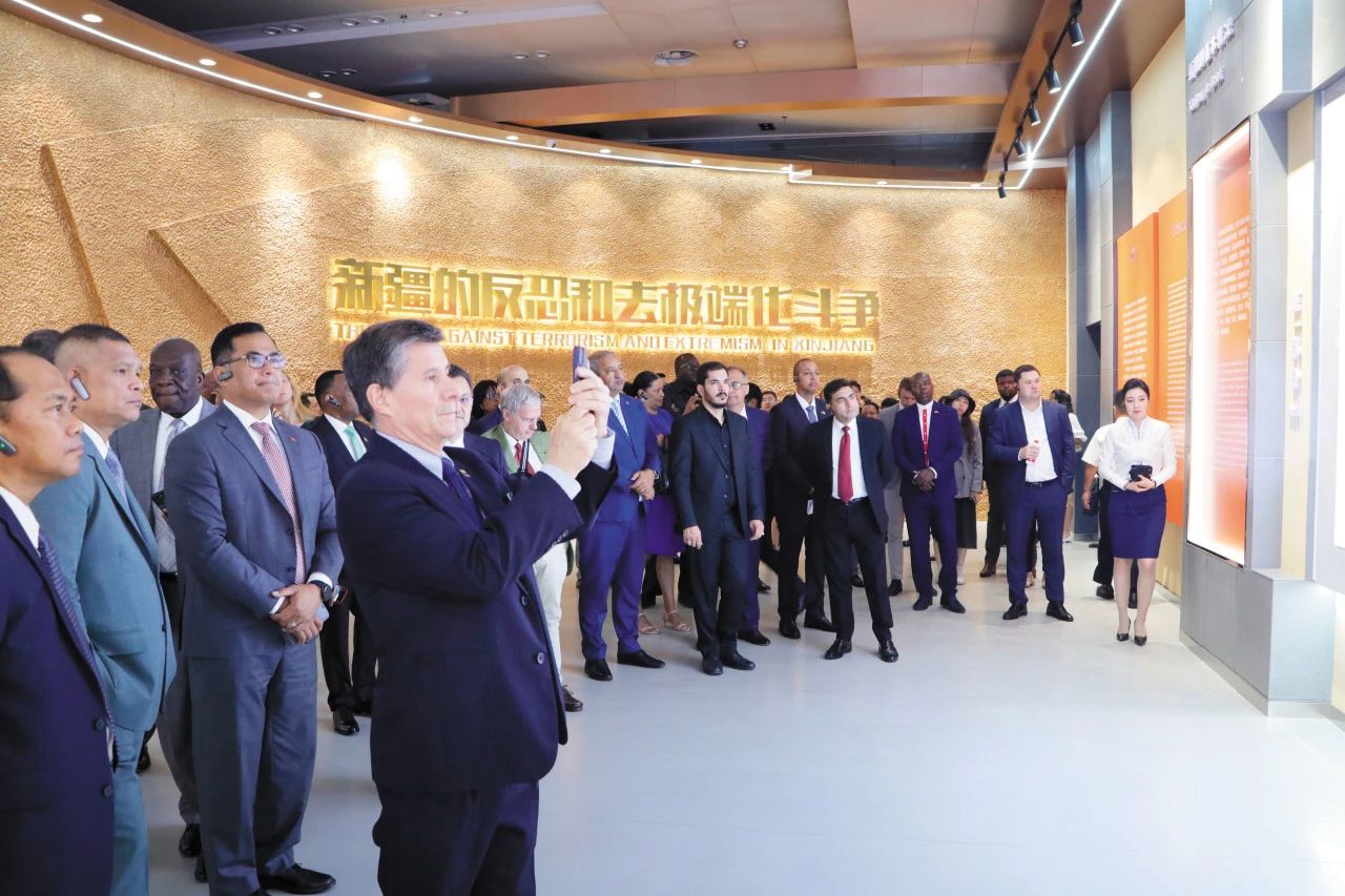 近年來,新疆依法打擊暴力恐怖犯罪,開展去極端化工作,最大限度消除滋生恐怖主義、宗教極端主義的土壤和條件,有力維護了新疆社會穩定和長治久安。2023年7月31日至8月4日,多米尼克、緬甸、伊朗等25國駐華使節參訪新疆烏魯木齊市、喀什地區和阿克蘇地區,實地感受新疆經濟社會發展。圖為8月4日參訪團成員在烏魯木齊參觀新疆的反恐和去極端化斗爭主題展。新華社記者?趙晨捷/攝