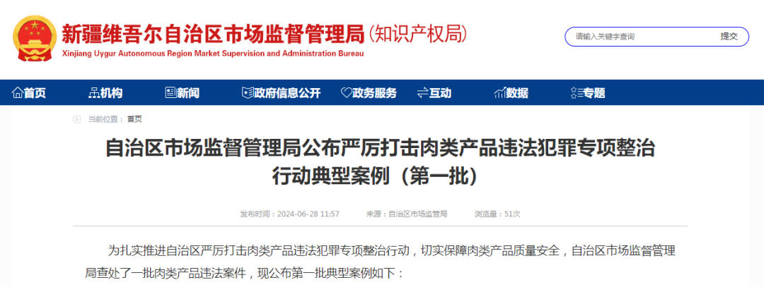 近日,自治區市場監督管理局網站公布嚴厲打擊肉類產品違法犯罪專項整治行動典型案例(第一批)。