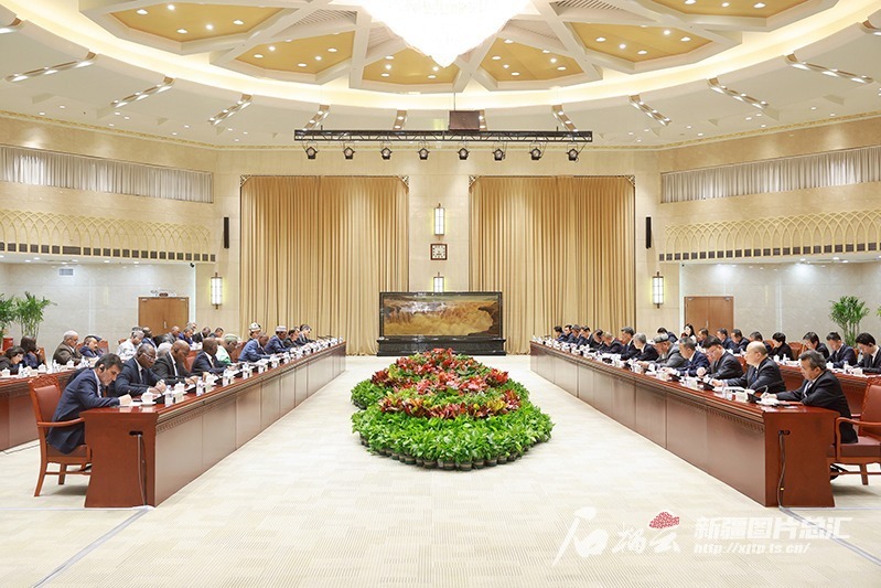 10月18日,自治區黨委書記馬興瑞、自治區主席艾爾肯·吐尼亞孜在烏魯木齊會見來新疆參訪的伊斯蘭合作組織代表團一行。天山網-新疆日報記者 崔志堅攝