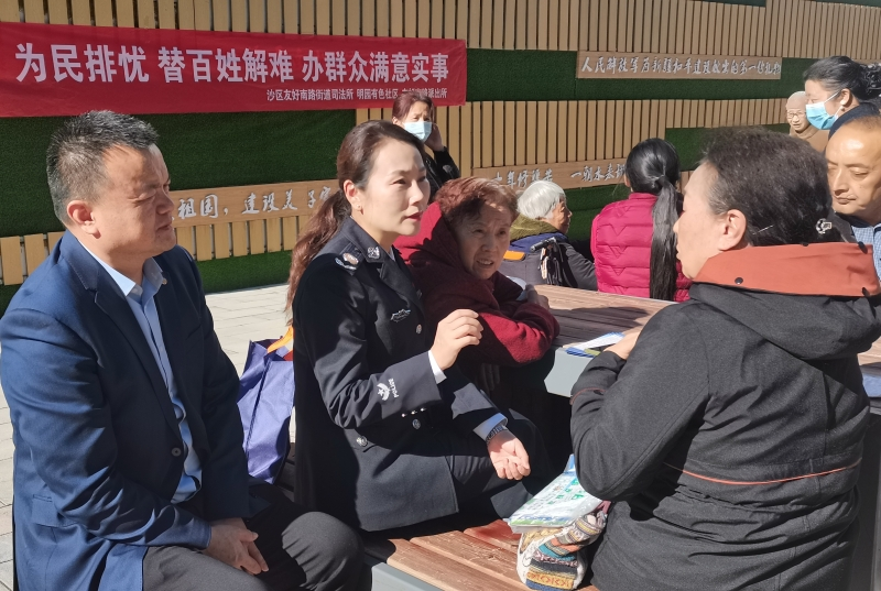 10月21日,烏魯木齊市沙依巴克區(qū)司法局友好南路司法所副所長(zhǎng)郭雪雁與北京盈科(烏魯木齊)律師事務(wù)所律師郭渠江(左一)一同為居民解答涉法問(wèn)題。通訊員 白雪晴 攝